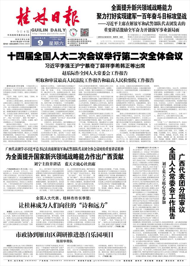 广西代表团学习习近平总书记在出席解放军和武警部队代表团全体会议时的重要讲话精神 为全面提升国家新兴领域战略能力作出广西贡献 刘宁主持并讲话 蓝天立鹿心社出席   广西新闻网北京3月8日电(特派记者陈贻泽 龚文颖)3月8日,十四届全国人大二次会议广西代表团在驻地召开第七次全体会议,学习习近平总书记在出席十四届全国人大二次会议解放军和武警部队代表团全体会议时的重要讲话精神。自治区党委书记、自治区人大常委会主任、广西代表团团长刘宁主持会议并领学。自治区主席、广西代表团副团长蓝天立,十四届全国人大环境与资源保护委员会主任委员鹿心社出席会议。