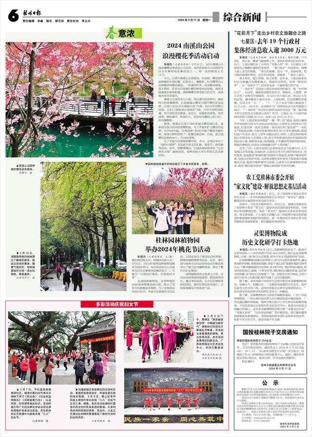 走进园林植物园,这里种植的3000多株碧桃竞相开放,吸引了众多市民游客前来观赏。为了庆祝国际劳动妇女节,丰富市民游客的文化生活,公园还举办了桃花知识科普展、碧桃树施肥修剪等活动。此外,该公园与桂林市定向运动协会还在桃花林举办了魅力定向越野活动,吸引了数百名妇女参加。
