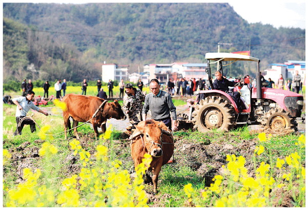 在春意盎然的农田里,春牛、传统农耕工具和大型机械化农耕机集中亮相,当地农人聚在一起举行开耕仪式,以此祈祷风调雨顺、五谷丰登。随后,村民牵牛犁地,开机耕田,开启一年新农事。