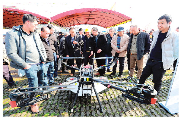 在农业无人机展示现场,众多村民围着无人机查看,专注地听着灌阳县农机服务中心工作人员的讲解。