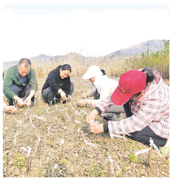 近年来,恭城瑶族自治县嘉会镇紧盯金槐米市场走俏、价格稳定等优势,进一步优化槐花产业结构,真正将“放大产业优势,拓展产业链条”作为乡村振兴和促进农民增收的重要举措。图为镇人大代表深入乡村指导金槐嫁接技术,为农民发展产业保驾护航。古明丽 摄