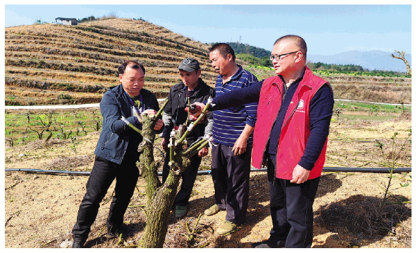 ◥全州县一科技特派员(右一)正在指导金槐种植户对金槐树进行高接换种。 邓琳 摄