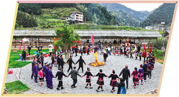 在龙胜乐江镇江口村,侗族群众和游客手牵手跳起欢快的团圆舞。