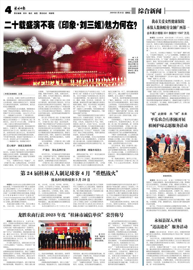 《印象·刘三姐》公演二十周年庆典盛大举行   本报讯(记者唐健扬)山水有相逢,终会到漓江。3月20日晚,阳朔县中国漓江山水剧场,大型山水实景演出《印象·刘三姐》公演二十周年庆典活动盛大举行。《印象·刘三姐》总导演王潮歌等艺术家与政商文旅界名人齐聚庆典现场,共襄盛举。