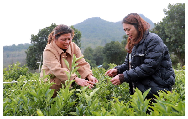 陈小燕与女儿在育苗基地察看果苗生长情况。