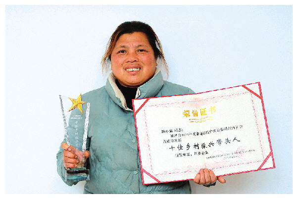 陈小燕展示获得的县级“十佳乡村振兴带头人”奖杯和证书。