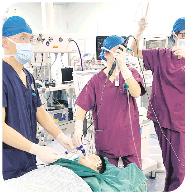 当天23时左右,救护车抵达市人民医院,经绿色通道,小李被直接送进了手术室,在麻醉科医务人员协助下,儿科主任何勤、主治医师蓝灵利决定先采用“纤维支气管镜+取石网篮”的方法取出卡在孩子气管里的果核。