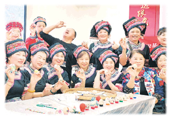 居民们身着民族服装,展示自己绘画的鸡蛋。 记者韦莎妮娜 摄