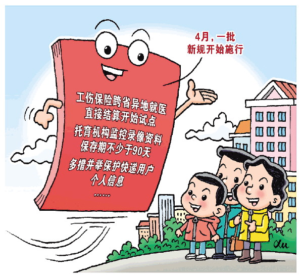 工伤保险跨省异地就医直接结算开始试点,托育机构监控录像资料保存期不少于90天,多措并举保护快递用户个人信息……2024年4月,一批将要施行的新规带来美好生活新愿景。