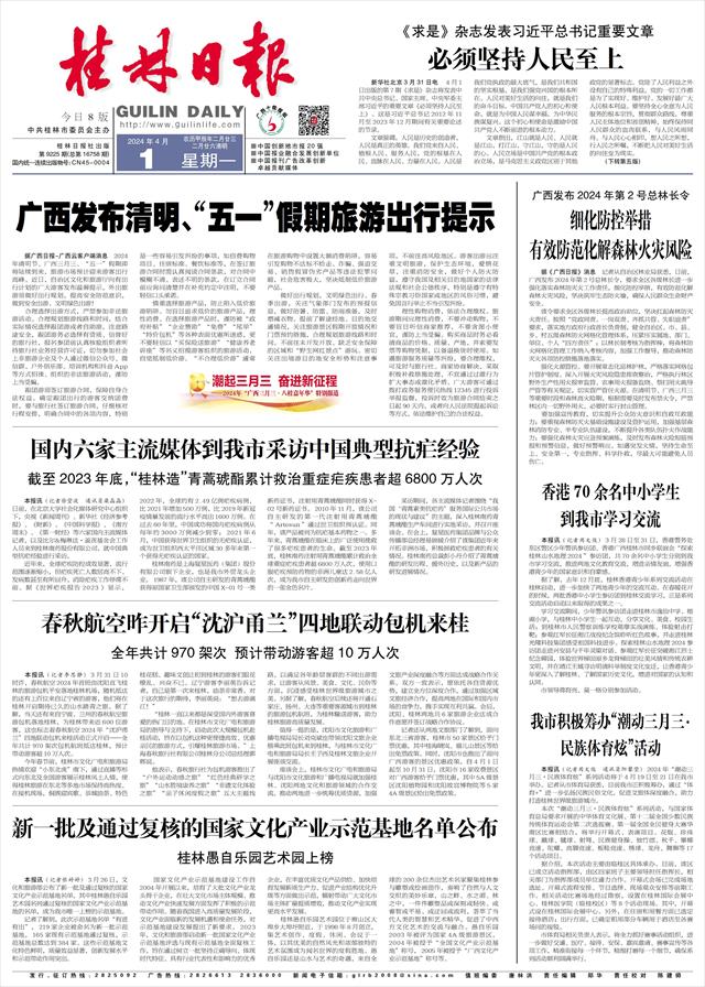 春秋航空昨开启“沈沪甬兰”四地联动包机来桂 全年共计970架次 预计带动游客超10万人次   本报讯(记者李思静)3月31日10时许,春秋航空2024年首班由沈阳直飞桂林的旅游包机平安落地桂林机场,随机抵达的还有上百位来自辽宁省的游客,他们将在桂林开启期待已久的山水踏青之旅。据了解,当天还有来自宁波、兰州的春秋航空旅游包机落地桂林,为桂林带来近600位游客,这也标志着春秋航空2024年“沈沪甬兰”四地联动包机来桂活动正式开启——全年共计970架次包机航班抵达桂林,预计带动游客超10万人次。