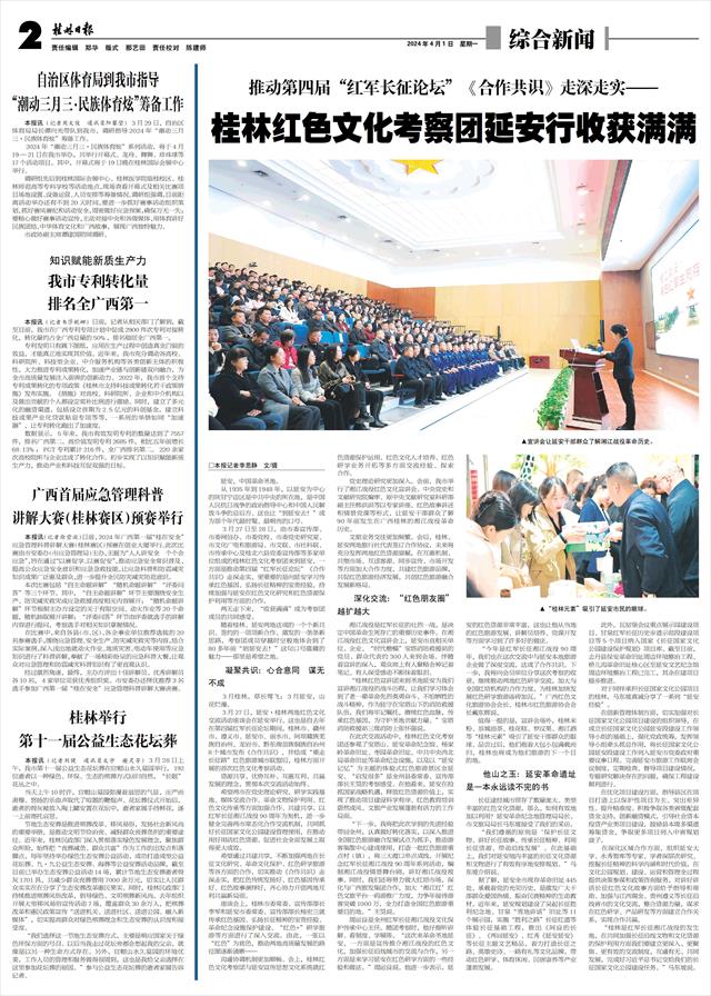 3月27日至28日,由市委宣传部、市委网信办、市委党校、市委党史研究室、市文化广电和旅游局、市文联、市社科联、市传承中心及桂北六县党委宣传部等多家单位组成的桂林红色文化考察团来到延安,一方面是推动第四届“红军长征论坛”《合作共识》走深走实,更重要的是向延安学习传承红色基因、弘扬长征精神的宝贵经验,持续加强与延安在红色文化研究和红色资源保护利用等方面的合作。