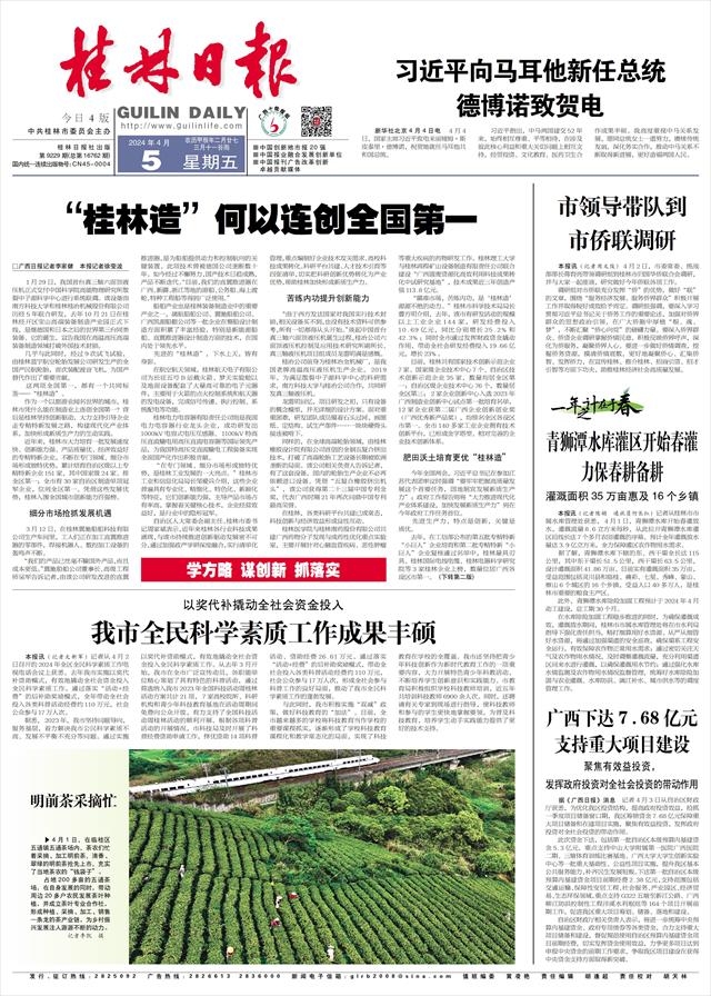 自治区人大常委会副主任、桂林市委书记周家斌表示,近年来桂林各行业科技成果涌现,与该市持续推进创新驱动发展密不可分,通过加强政产学研深度融合,实行清单化管理,重点编制好企业技术攻关需求、高校科技成果转化、科研平台共建、人才技术引育等四张清单,切实把科研创新优势转化为产业优势,帮助桂林加快形成新质生产力。