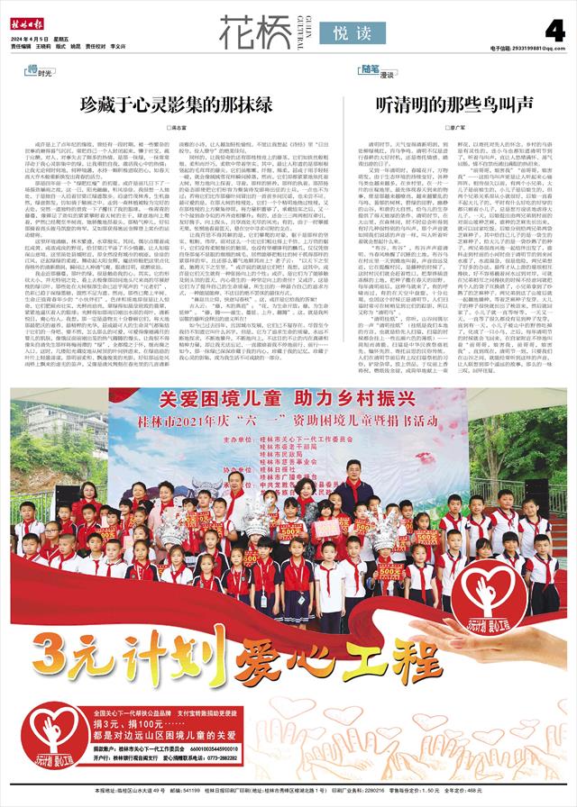 “清明挂纸”,你听,山谷间偶尔的一声“清明挂纸”(挂纸是我们本地的方言,也就是给先人扫墓,扫墓的时候都会挂上一些五颜六色的薄纸)……简短而清脆。扫墓是中华民族祭奠祖先、缅怀先烈、寄托哀思的民俗传统。人们在清明节前后有上坟扫墓祭祖的习俗,铲除杂草,放上供品,于坟前上香祷祝,燃纸钱金锭,或简单地献上一束鲜花,以寄托对先人的怀念。乡村的鸟语是有灵性的,连小鸟也都知道清明节到了,听着鸟叫声,直让人愁绪满怀、荡气回肠,情不自禁而涌出满眼的热泪来。