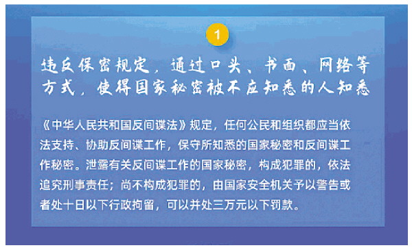 在第九个全民国家安全教育日到来之际,国家安全机关14日公布5起典型案例,呼吁全社会提高国家安全意识,共筑反间防谍的钢铁长城。