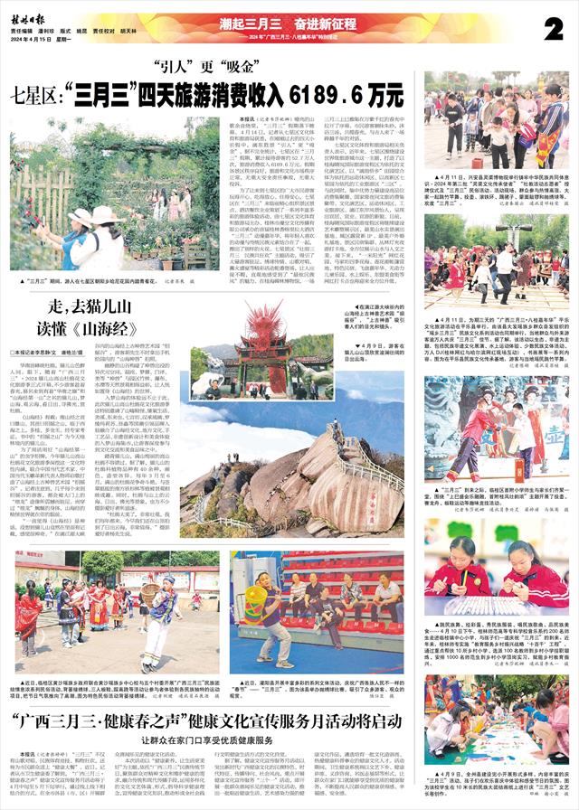 “引人”更“吸金” 七星区:“三月三”四天旅游消费收入6189.6万元   本报讯(记者韦莎妮娜)嘹亮的山歌余音绕梁,“三月三”假期落下帷幕。4月14日,记者从七星区文化体育和旅游局获悉,在刚刚过去的四天小长假中,漓东胜景“引人”更“吸金”。据不完全统计,七星区在“三月三”假期,累计接待游客约52.7万人次,旅游消费收入6189.6万元。假期各景区秩序良好,旅游和文化市场秩序正常,无重大安全责任事故,无重大投诉。