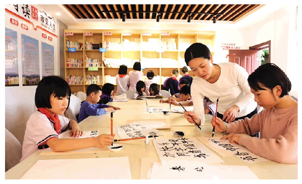 4月22日,平乐县启动“深化全民阅读 建设书香平乐”全民阅读月系列活动,通过推荐喜欢的一本书、经典诵读等方式,倡导全民阅读。图为该县桥亭乡小学生在农家书屋练书法、进行课外阅读。苏桂 摄