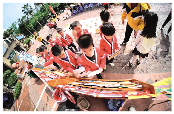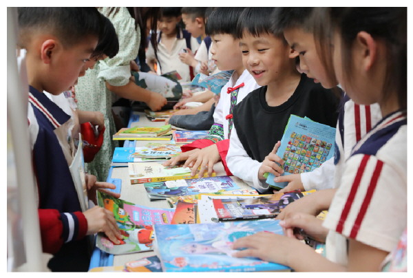 4月23日,市芦笛小学开展主题为“最美人间四‘阅’天,春风漫卷书香来”校园读书节系列活动,通过形式多样的读书活动培养学生们的阅读兴趣,掀起校园里的读书热潮。图为学生们在校园书市选择自己喜爱的图书。记者陈静 摄