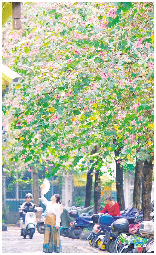 近日,市区许多道路两旁种植的紫荆花已盛开,引来众多行人驻足欣赏。图为在桂林热门紫荆花“打卡点”东华路上,游人在赏花拍照。记者苏展 摄