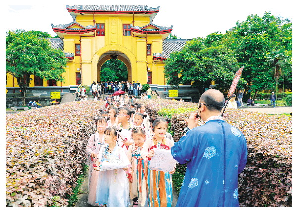 ◤5月1日,在王城景区内,导游带着一个游学团队在景区内游览,感受桂林深厚的历史文化底蕴。