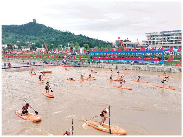▲单人桨板赛竞速漓江。 记者唐艳兰 摄