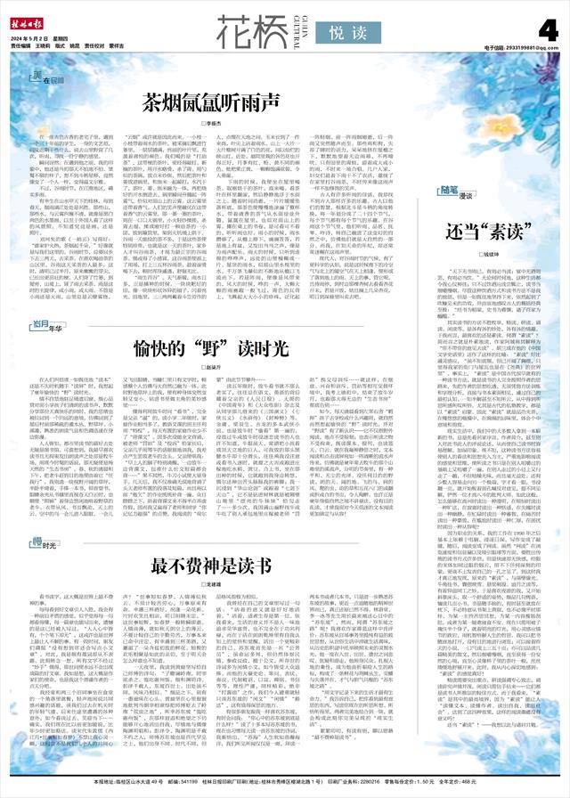其实读书的方法不胜枚举,精读、研读、诵读、闲读等,是各有各的妙处,各有各的情趣。于我而言,最喜欢的还是素读。何谓“素读”?简而言之就是朴素地读,作家阿城将其解释为“你不带你的意见去读”。胡兰成在他的《中国文学史话里》还作了这样的比喻:“素读”好比通灵感应,“虽不知底细,但已开阔了胸襟,只觉得我家的街门与屋瓦也是在《尧典》的世界里”。事实上,“素读”是中国古代很早就有的一种读书方法,就是读书的人完全按照作者的思路来,先把作者的思想吃透,无须凭借方法训练和学理分析,直接与书本素面相见,通过自己的最初认知、一知半解甚至不知所云,从中得到所思所感所叹所悟。尤其是古代的私塾教学,都是以“素读”启蒙。因此“素读”就是品功夫茶,在慢悠悠的咂摸中,在绵绵的回味里,体会个中意境和韵致。
