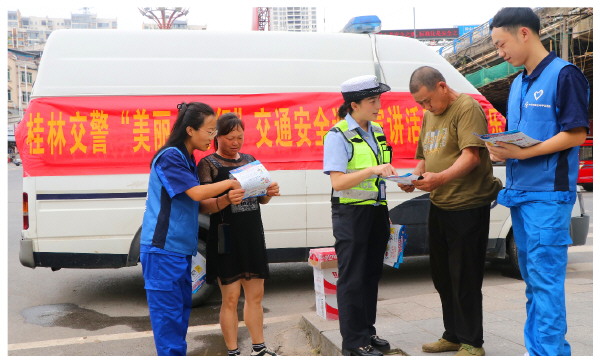 ▲5月1日,中交路建平昭高速TJ1分部的志愿者向节日执勤的一线民警送去慰问品,同时还加入桂林交警“美丽乡村行”交通安全巡回宣传活动,向当地居民发放交通宣传材料,为交通安全贡献自己的一份力量。