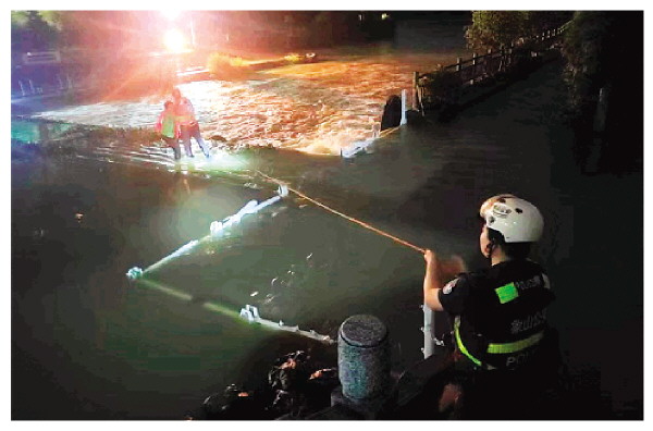 此时已是深夜,水流湍急,水面一片漆黑,无法直接看到受困群众,也听不见其呼救声。到场的救援警员立即根据报警群众描述的方位,一边不断喊话、闪灯,一边快速前往离水坝最近的景区进出口。