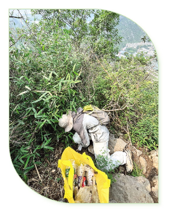 “山上有不少垃圾藏在陡峭的山坡下,我们只能小心翼翼地攀着树干下去,用夹子一点一点夹出来。”张绍鹏告诉记者,“有的时候拨开荆棘,发现下面藏着好多垃圾,塑料水瓶、食品包装袋、塑料袋、用过的卫生纸等层层堆积,捡起来很费劲。”