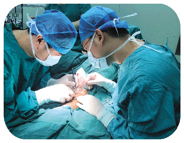 欧俊(左一)为患者做人工血管手术。 (桂医附院肾内科供图)
