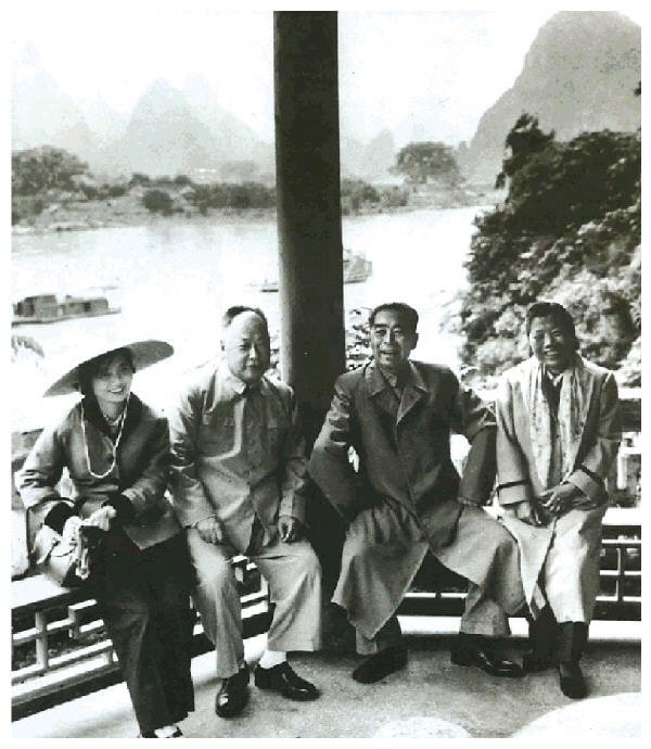 图③:1960年5月15日,周恩来总理、陈毅副总理、邓颖超同志和张茜同志四人在阳朔的一个凉亭里休息时的合影。图中从左到右依次是:张茜、陈毅、周恩来、邓颖超。 陈亚江 摄