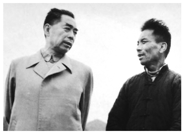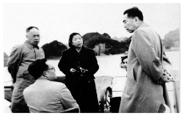 图②:1960年5月,国务院总理周恩来(右一)、副总理陈毅(左一)、邓颖超(中)视察漓江。 陈亚江 摄