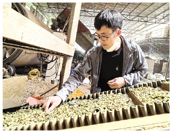 梁波是柿叶加工厂的负责人,他告诉记者,其父辈在嘉会镇经营中草药材收购及粗加工生意,收购柿叶是主业之一,已有20多年历史。2014年,他从父辈那里接管了药材厂。近年来,加工厂收购的柿叶一部分销售给桂林本地的生物公司制作药品,另一部分卖给一些企业用来制作柿叶茶。不过,往年收购的柿叶以秋冬季的干柿叶为主,从今年开始,该厂才逐渐扩大收购新鲜柿叶的规模。