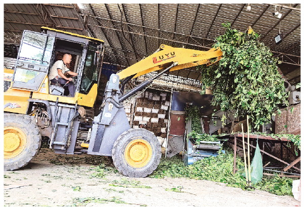 ▼嘉会镇的一家柿叶加工厂内,工人驾着挖掘机运输柿叶。