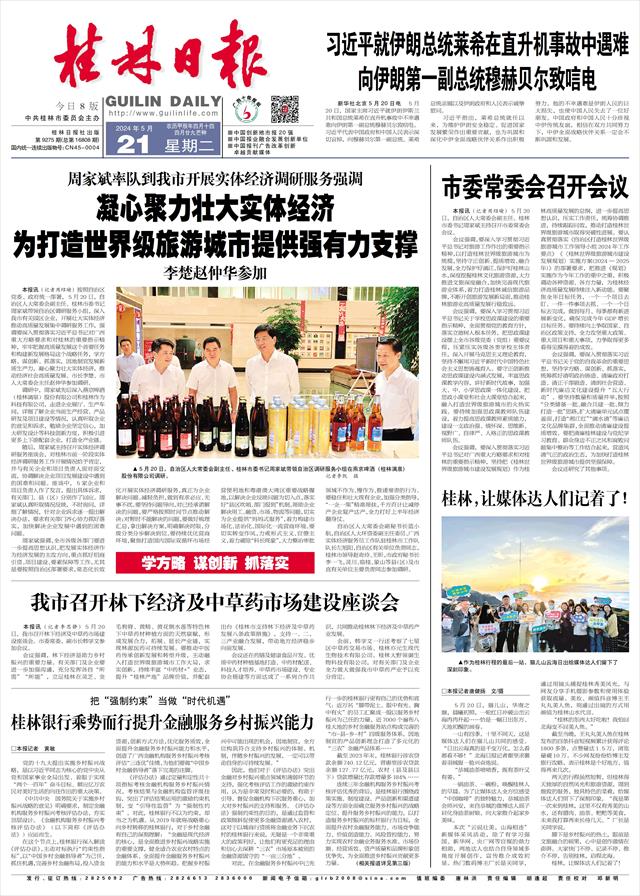 本报讯(记者周绍瑜)按照自治区党委、政府统一部署,5月20日,自治区人大常委会副主任、桂林市委书记周家斌带领自治区调研服务小组,深入我市有关园区企业,开展壮大实体经济推动高质量发展集中调研服务工作,强调要深入贯彻落实习近平总书记对广西重大方略要求和对桂林的重要指示精神,牢牢把握高质量发展这个首要任务和构建新发展格局这个战略任务,学方略、谋创新、抓落实,因地制宜发展新质生产力,凝心聚力壮大实体经济,推动经济社会高质量发展。市长李楚、市人大常委会主任赵仲华参加调研。