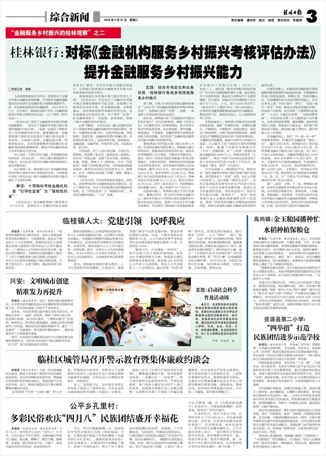 连续三年金融机构服务乡村振兴考核评估优秀的背后,是桂林银行围绕政策实施、制度建设、产品创新和渠道建设等方面全面确立服务乡村振兴的战略定位、提升服务乡村振兴的能力,以打造服务乡村振兴的标杆银行为目标,全面提升农村金融服务能力、市场竞争能力、价值创造能力、风险管控能力,努力实现农村金融业务服务水准、市场份额、经营质效、资产质量和品牌形象创优争先,为全面推进乡村振兴贡献更多力量。 (相关报道详见第三版)