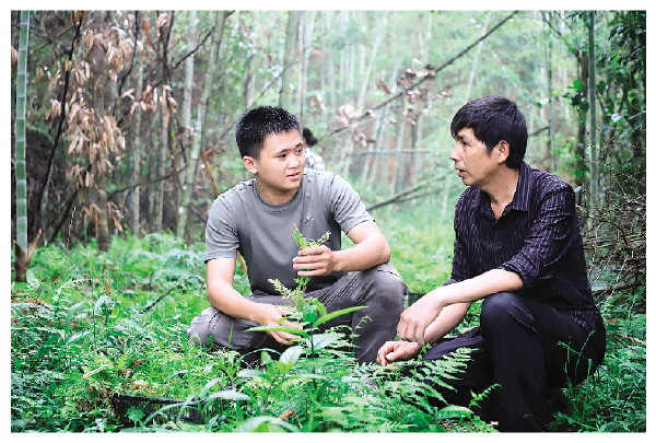 ▲周思发(右)在查看金毛狗蕨生长情况。