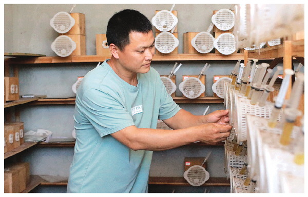 薛帆正在给盒子里的蜂喂食。 记者刘菁 摄