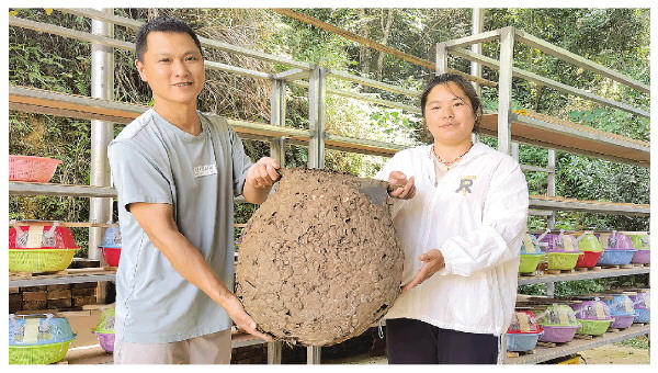 夫妻两人展示留下来的巨大蜂巢。 记者刘菁 摄