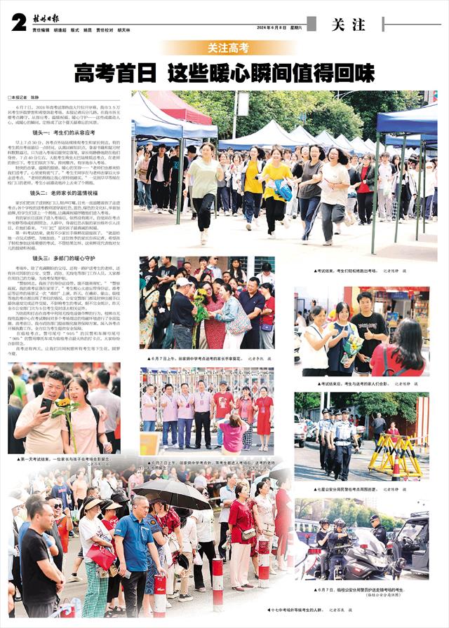 6月7日,2024年高考这部热血大片拉开序幕,我市3.5万名考生怀揣梦想和希望奔赴考场。本报记者兵分几路,在我市各主要考点蹲守,从容应考、温情祝福、暖心守护……这些或激动人心,或暖心的瞬间,定格成了这个夏天最难忘的风景。