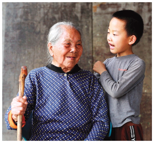 刘奎珍老人与7岁的曾孙侯椅焌在聊天。