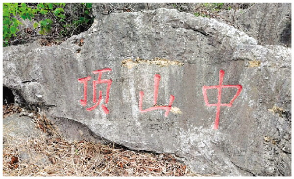 既然黄埔军校的校长有了纪念石刻,作为黄埔军校创始人的孙中山自然更不可少,从“介石岩”往上攀登直至山顶,一块镌刻着“中山顶”三个大字的石刻赫然在目,这件宽约2米的石刻位于山顶无遮无挡,风化严重,字口已经非常浅(甚至导致“顶”字填色错误),而且上下款被人为凿掉,只能依稀看出上款的“中华民”三字,不过从罗卓英的“中山顶”题诗来看,这件石刻显然刻于第六分校时期,而且很可能也是罗卓英手笔。诗云: