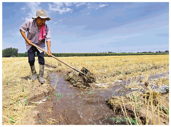 6月16日,山东省青州市黄楼街道孙家村农民在田地里抽水浇灌。