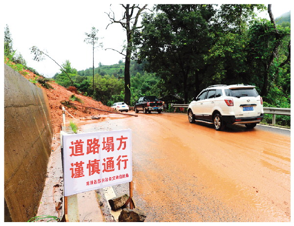 6月18日,在瓢里镇交州村路段,龙胜各族自治县交通运输局在道路塌方处设置了警示标志。 记者李忠波 通讯员潘志祥 摄