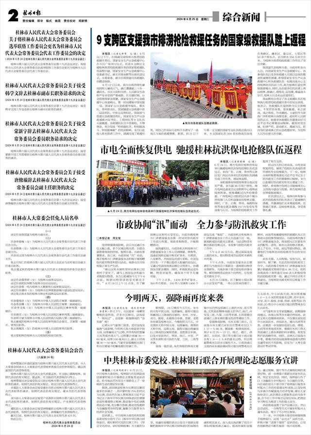 市电全面恢复供电 驰援桂林抗洪保电抢修队伍返程   本报讯(记者唐健扬 文/摄)6月24日,南方电网在桂林供电局举行驰援桂林抗洪保电抢修队伍欢送仪式,来自广东、云南、贵州等五省区及广西区内各单位的抢修队伍圆满完成工作任务,将陆续返程。