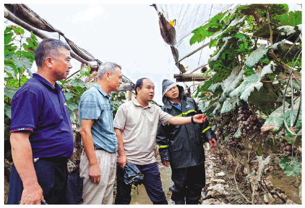 “几位专家,麻烦你们来帮我看看,我家的巨峰葡萄被水淹了,接下来该怎么管护?”在隔壁的葡萄园内忙碌的种植户秦军得知有农技专家入园指导,赶紧上前“求助”。秦军种有10亩葡萄,其中近9亩被淹,对于洪涝灾害后葡萄如何施救、管护,他心里着急却又苦于没有技术。