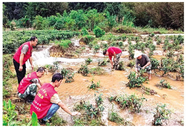 近日,因受到暴雨袭击,平乐县大发瑶族乡黄龙村大部分农作物被洪水淹没。为了减少洪灾造成的损失,保护人民生命财产安全,桂林市交通运输信息中心的驻村第一书记组织队员及村两委干部、党员群众到农户家中迅速转移人员和物资,并开展灾后自救等工作。目前,黄龙村无人员伤亡情况。图为驻村第一书记组织队员及村两委干部、党员群众对受灾农作物进行护理。蒙炳勇 摄