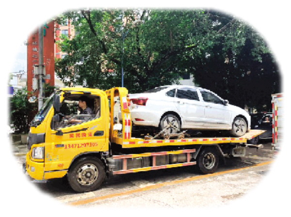 连日来,市区道路上随处可见被水泡过的车辆被拖车拉走。 记者周文琼 摄