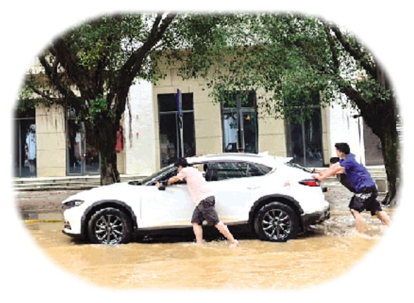 车辆被水泡后不能再启动,几名男子合力将车推出积水区域,然后再让拖车运到修理厂维修。 记者周文琼 摄