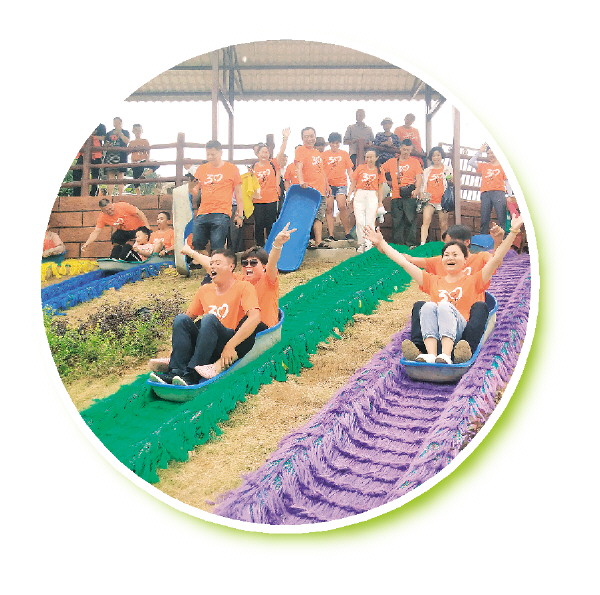 在十里平坦金紫山丰绿生态园,游客体验游玩项目。