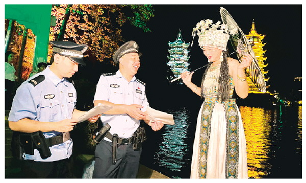 民警在杉湖景区开展巡逻防范工作,并向过往游客群众发放反诈宣传单。 易丹 摄